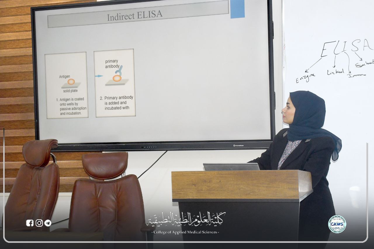 أما الجانب العملي، فقد ركّز على كيفية تشغيل جهاز ELISA، وخطوات إجراء الاختبار، ورسم المنحنى القياسي، واستخراج قيم التراكيز للعَيِّنات المقاسة، بالإضافة إلى تطبيقات هذه التقنية في الكشف عن التفاعلات المناعية وقياس كفاءة الارتباط بين الأجسام المضادة والمستضدات.