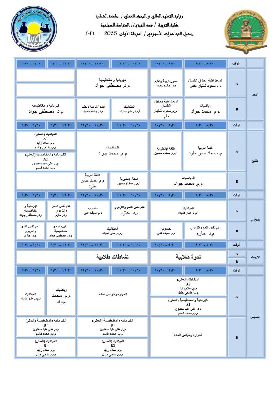 جدول قسم الفيزياء (الدراسة الصباحية 2025 - 2026 )