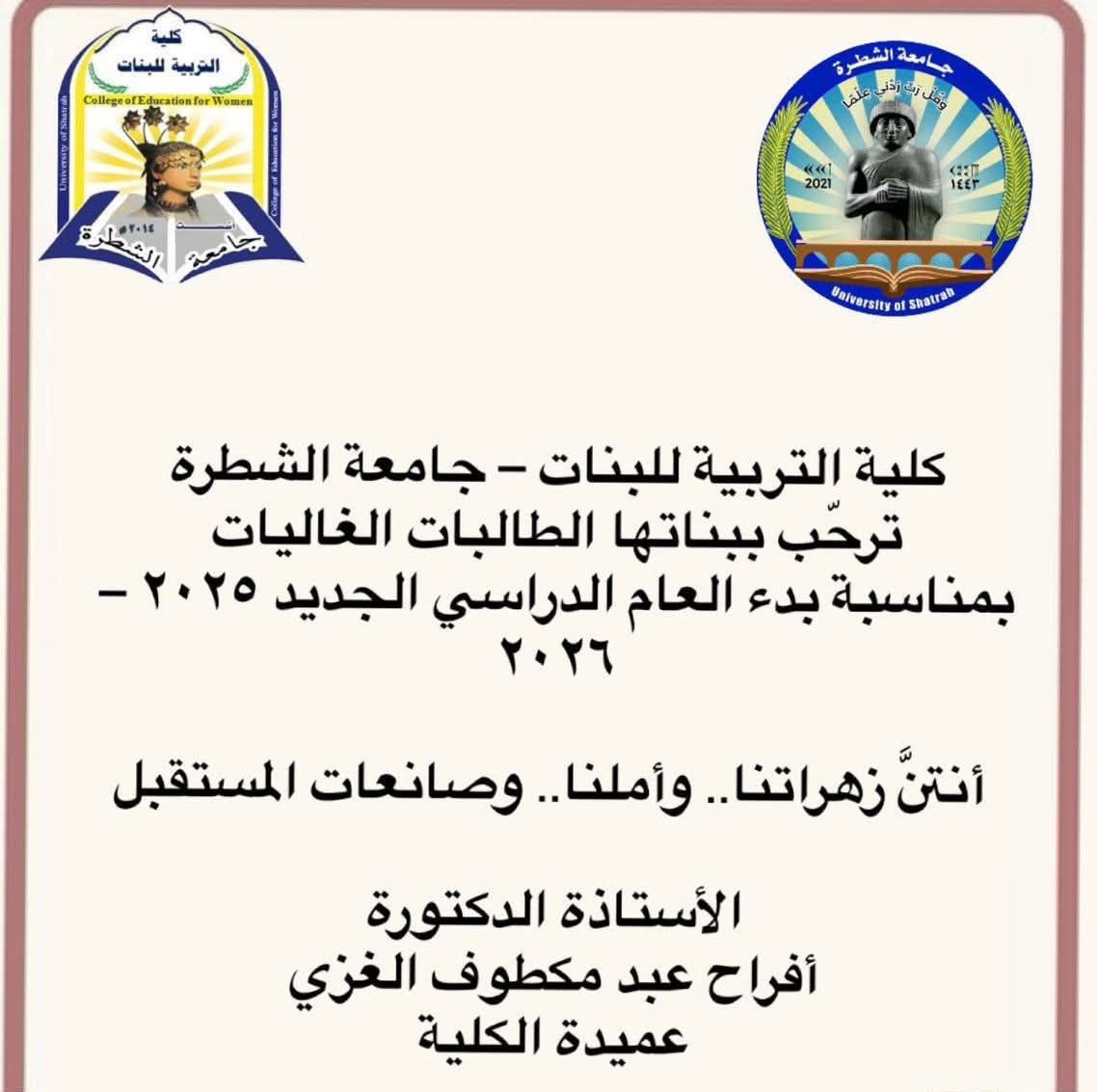 بكل فخرٍ واعتزاز، تستقبل كلية التربية للبنات في جامعة الشطّرة طالباتها الجدد في العام الدراسي الجديد، متمنّية لهن مسيرةً علميةً عامرةً بالنجاح والإبداع والعطاء.