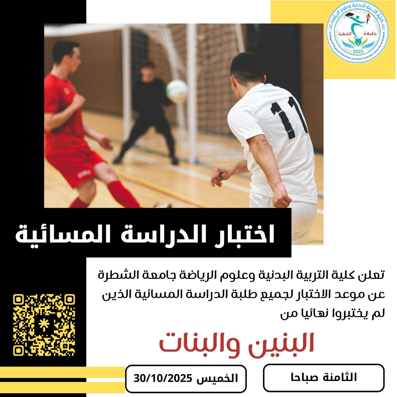 كلية التربية البدنية وعلوم الرياضة جامعة الشطرة ( موعد اختبار طلبة الدراسة المسائية)