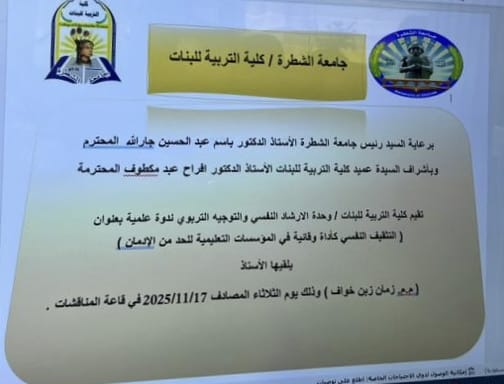 برعاية مكتب السيد رئيس الوزراء/ اللجنة الوطنية الداعمة للتوعية والإرشاد المجتمعي، وبإشراف مباشر من السيد رئيس جامعة الشطرة الأستاذ الدكتور باسم عبد الحسين جار الله، والسيدة عميد كلية التربية للبنات الأستاذة الدكتورة أفراح عبد المكتوف، أقامت كلية التربية للبنات ندوة علمية بعنوان "التثقيف النفسي كأداة وقائية في المؤسسات التعليمية للحد من الإدمان"، بمشاركة الأستاذ (م.م. زمان زبن خواف).