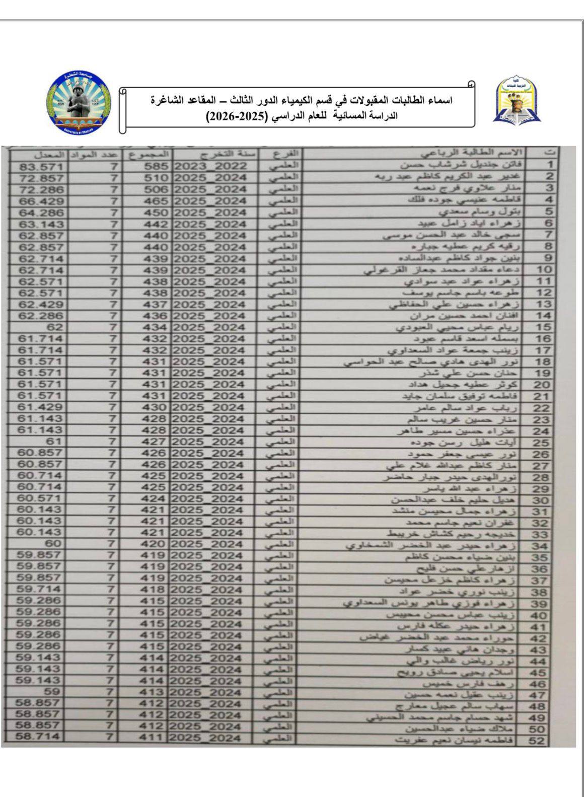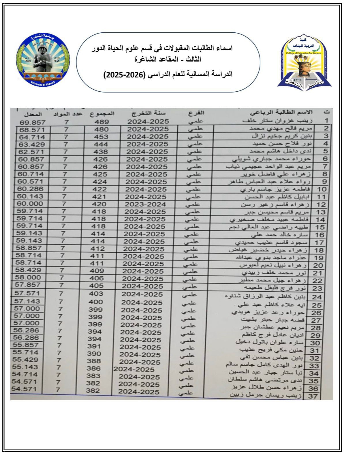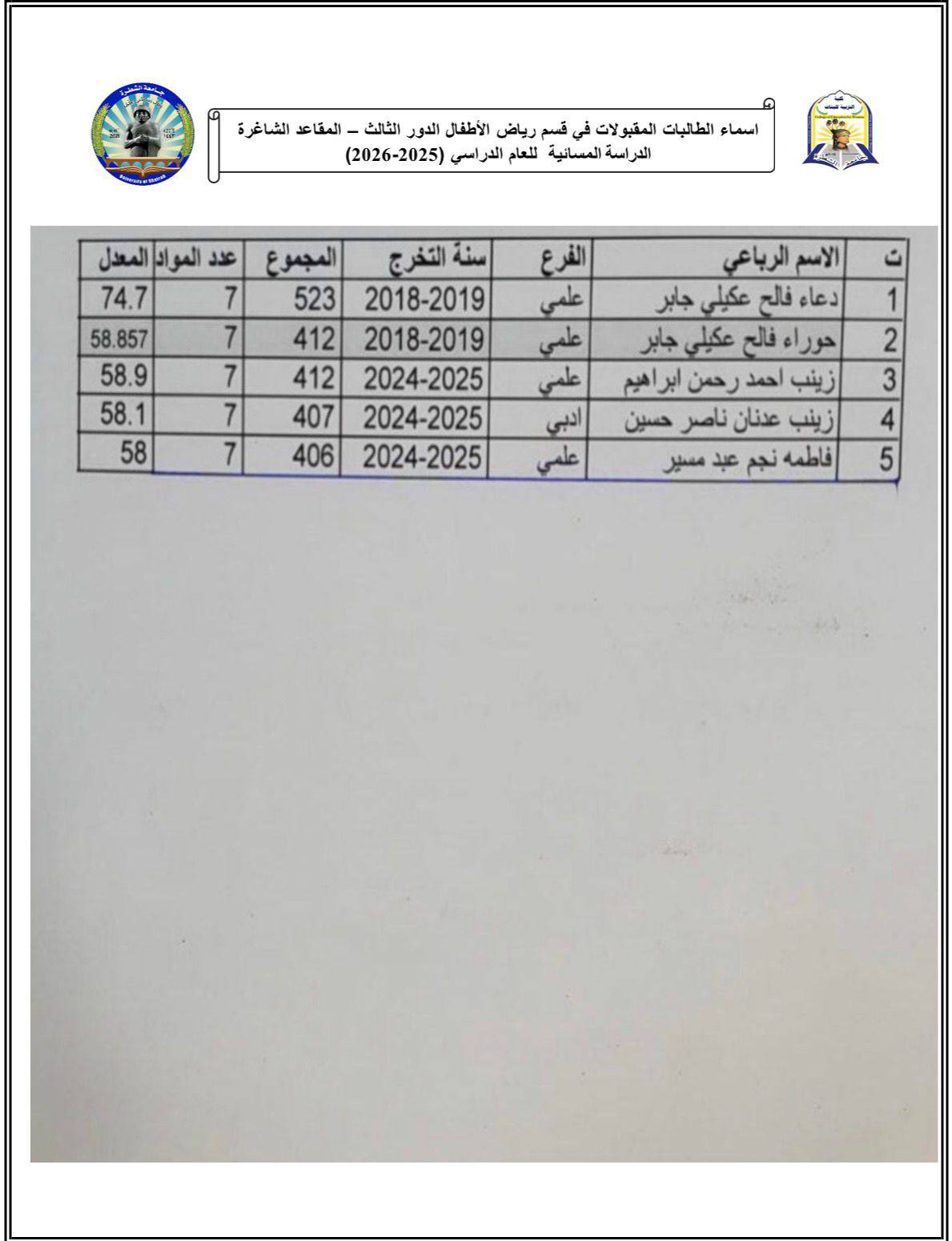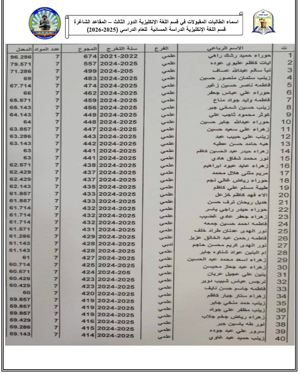 تُعلن كلية التربية للبنات – جامعة الشطرة أسماء الطالبات المقبولات في أقسام الكلية ضمن الدراسة المسائية (سدّ المقاعد الشاغرة) وخريجات الدور الثالث، وذلك استناداً إلى الضوابط والتعليمات الوزارية النافذة.