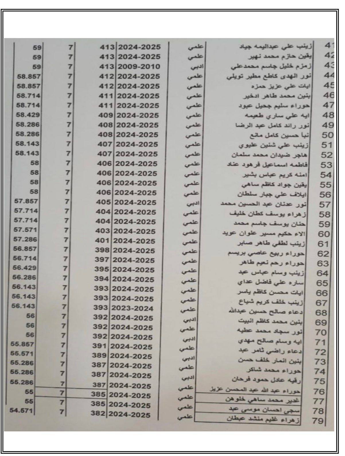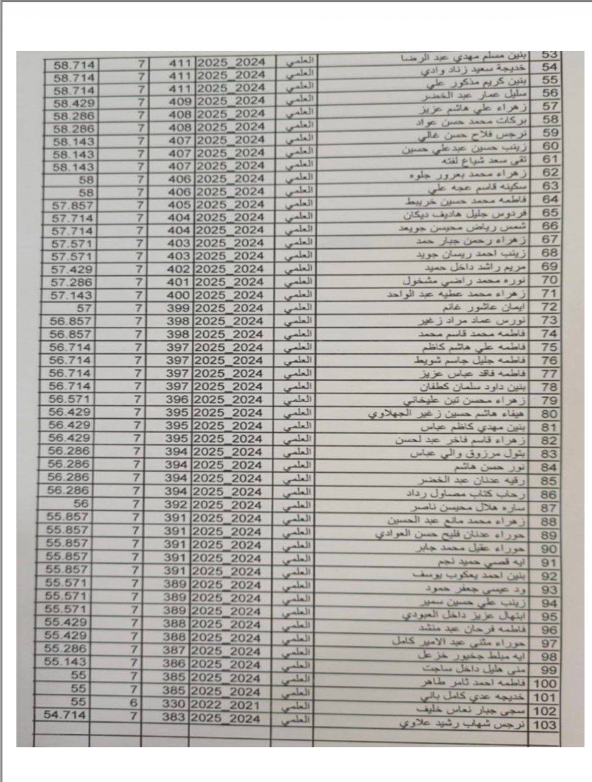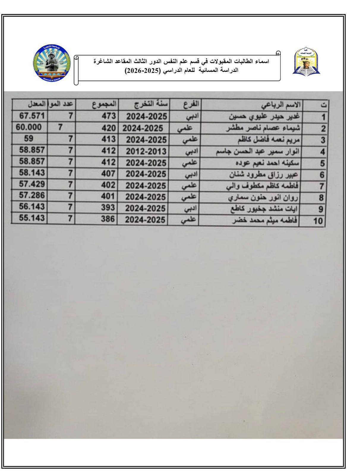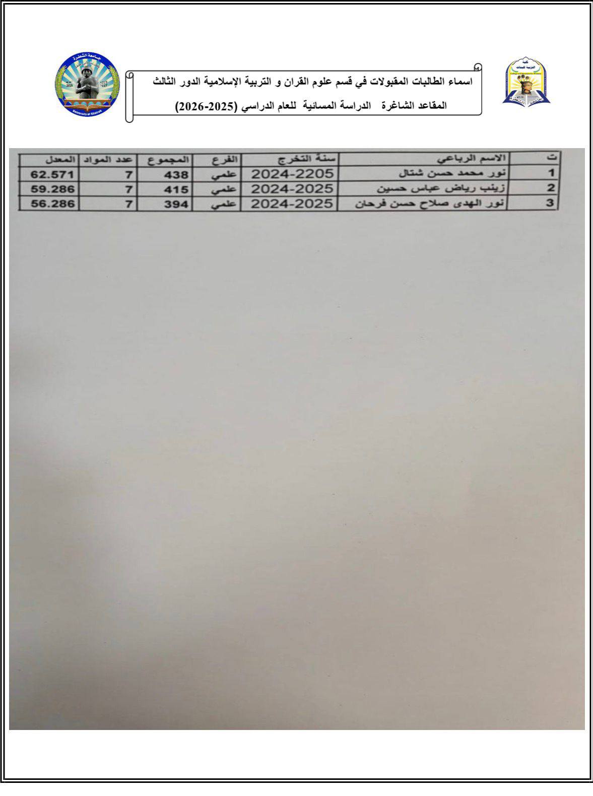 تُعلن كلية التربية للبنات – جامعة الشطرة أسماء الطالبات المقبولات في أقسام الكلية ضمن الدراسة المسائية (سدّ المقاعد الشاغرة) وخريجات الدور الثالث، وذلك استناداً إلى الضوابط والتعليمات الوزارية النافذة.
