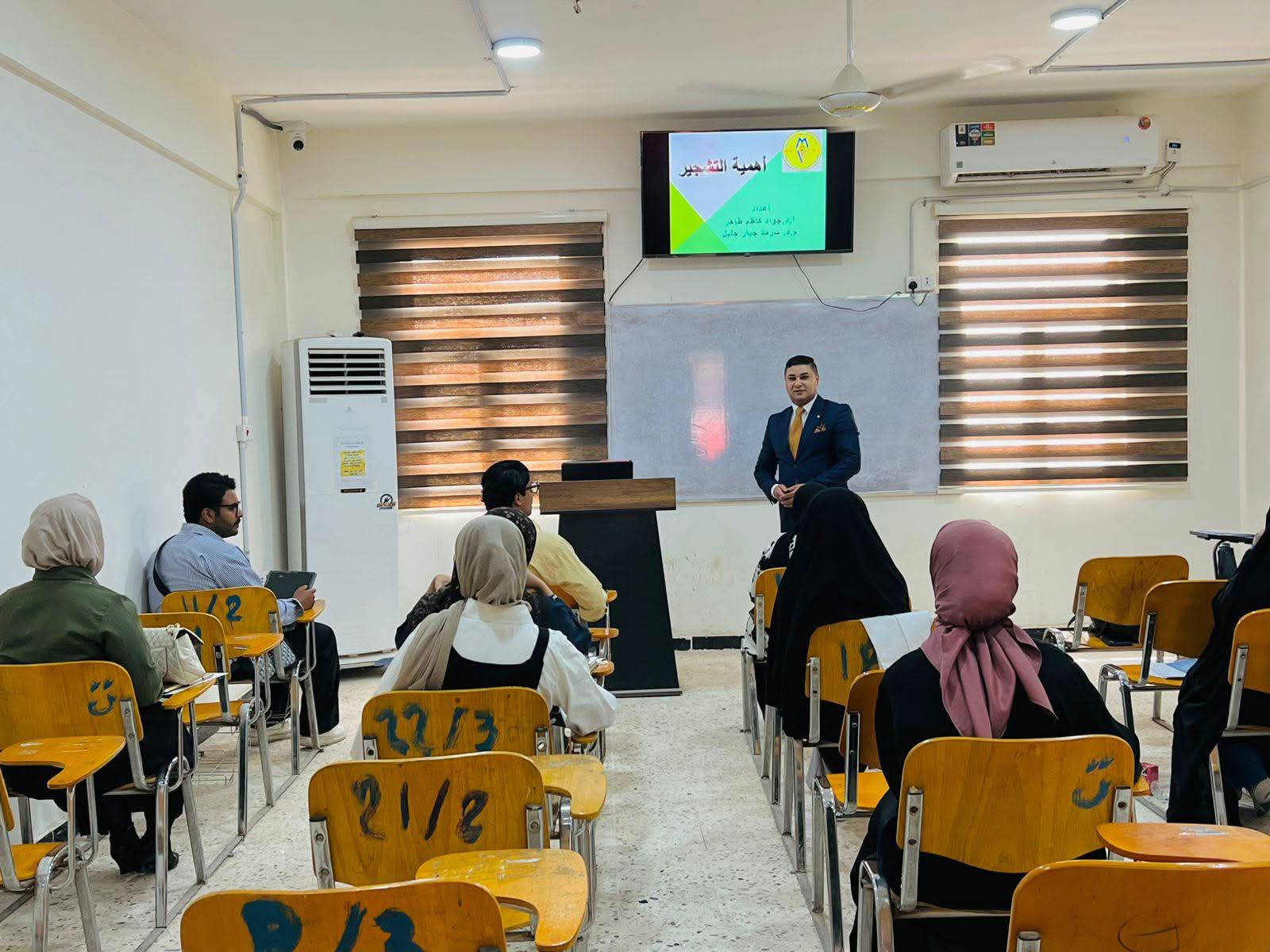حاضر في الورشة م.د سرمد جبار جليل، حيث تناول خلال محاضرته أهمية التشجير في الحد من التغيرات المناخية، ودوره في تحسين جودة الهواء والحفاظ على التنوع الأحيائي، فضلاً عن تأثيره الإيجابي في دعم التوازن البيئي والحد من ظاهرة التصحر.