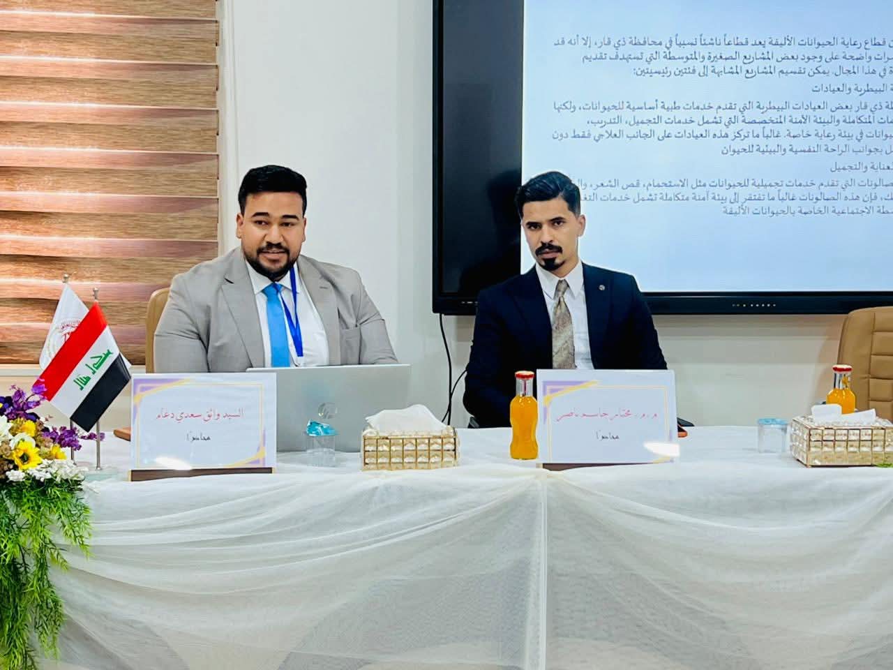 The seminar was presented by Assistant Lecturer Mokhtar Jassim Nasser and Mr. Wathiq Saadi Daam, who reviewed the basic steps for planning veterinary projects, explained the importance of sound management and innovation in developing veterinary services, and discussed the main challenges that entrepreneurs in this field may face and ways to overcome them.