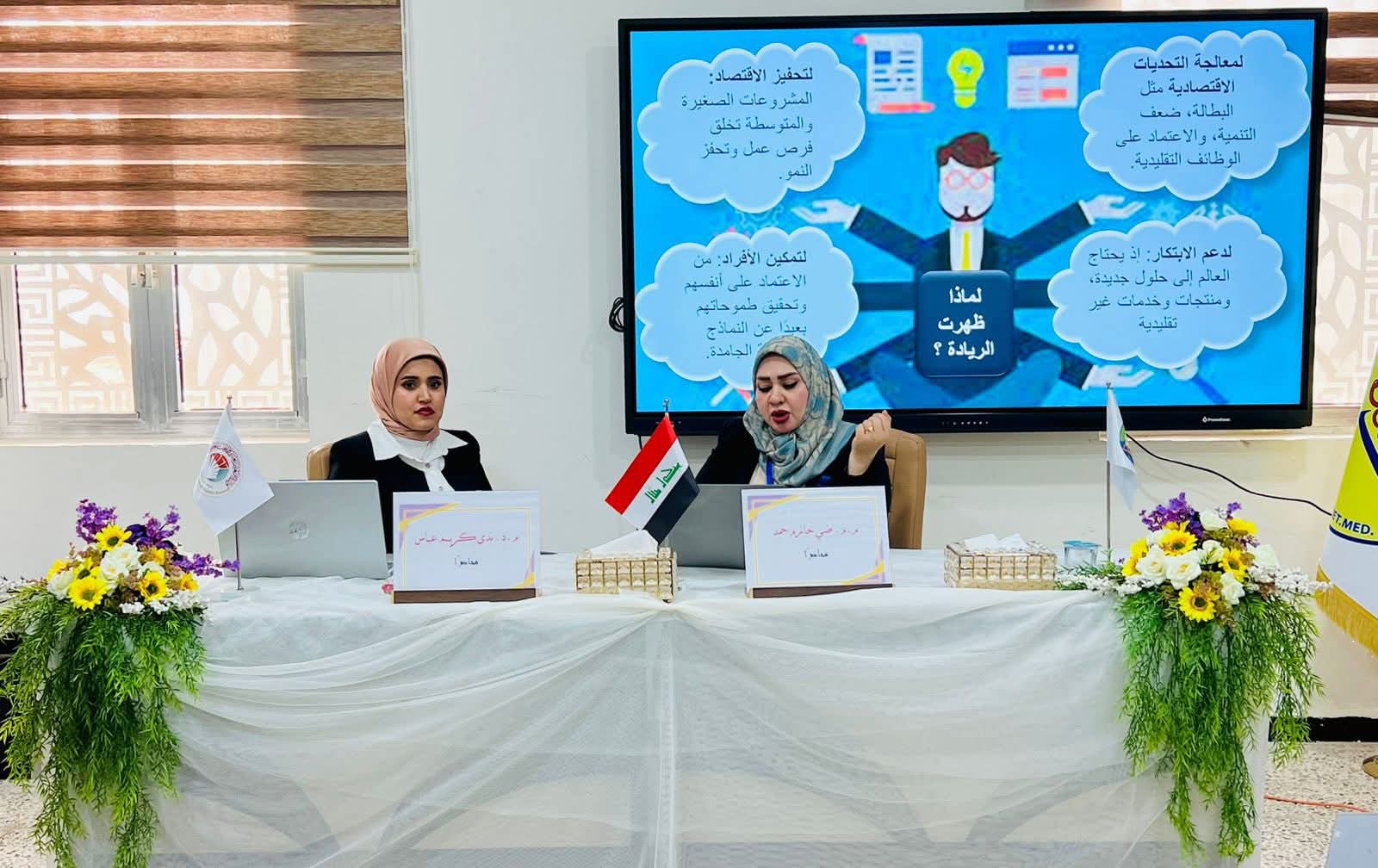 The symposium was entitled “The Concept of Entrepreneurship and Innovation in Higher Education”, and was presented by Assistant Professor Dr. Nada Kareem Abbas and Lecturer Dia Hazem Hamad. The symposium addressed the importance of instilling the concepts of entrepreneurship and innovation in educational institutions, and their role in preparing a generation with creative skills capable of keeping pace with scientific and technological developments.