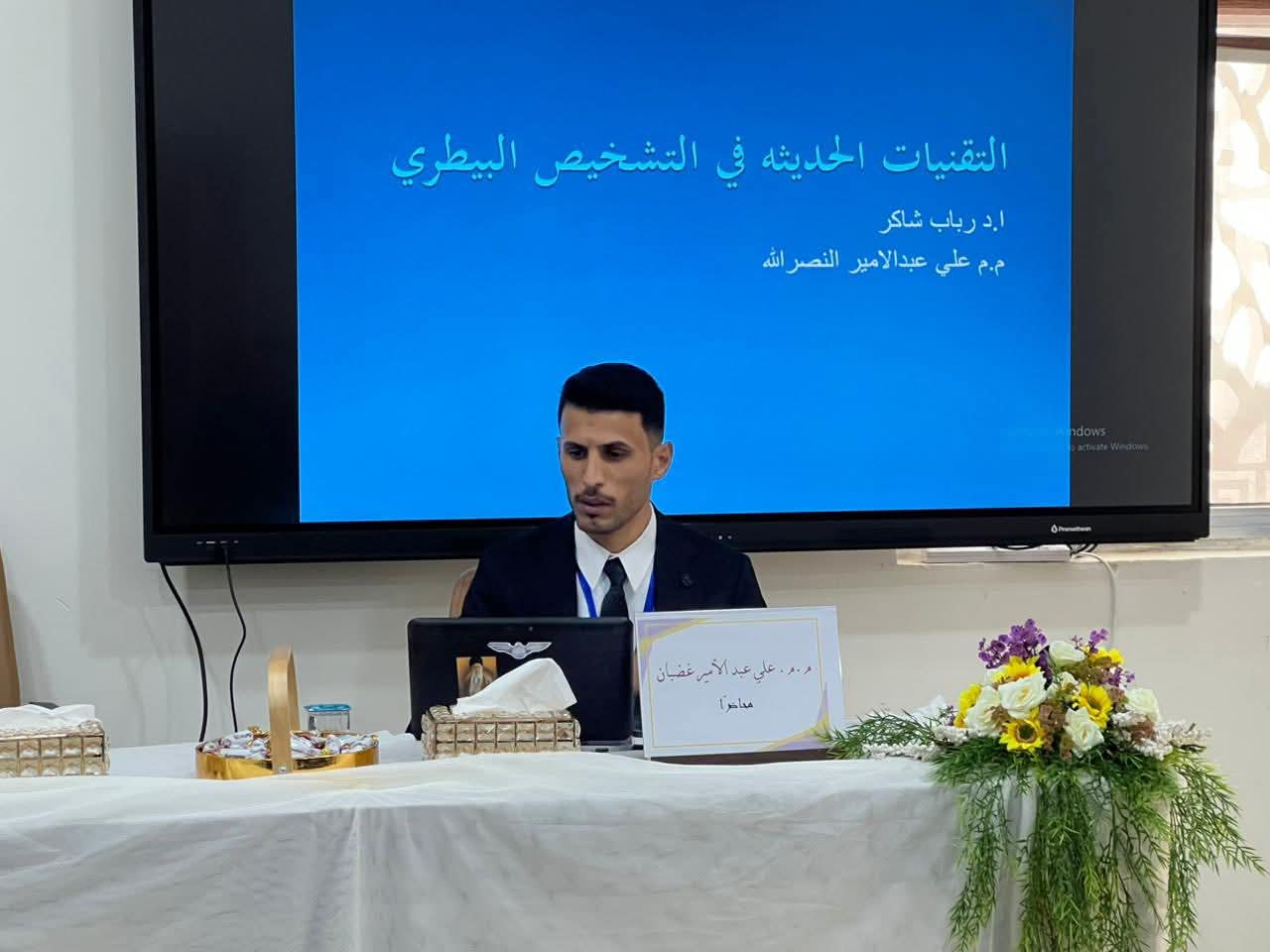 The workshop was presented by Lecturer Ali Abdul Amir, who discussed the most prominent technological developments used in diagnosing and treating animal diseases, as well as reviewing the role of modern technologies in improving animal production and enhancing veterinary services, in line with scientific and technological progress in this field.