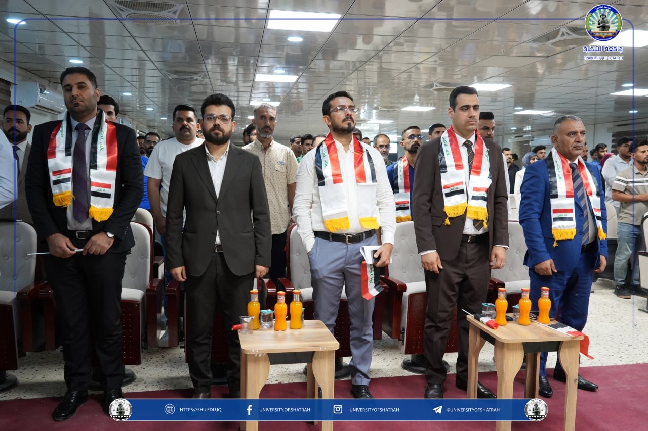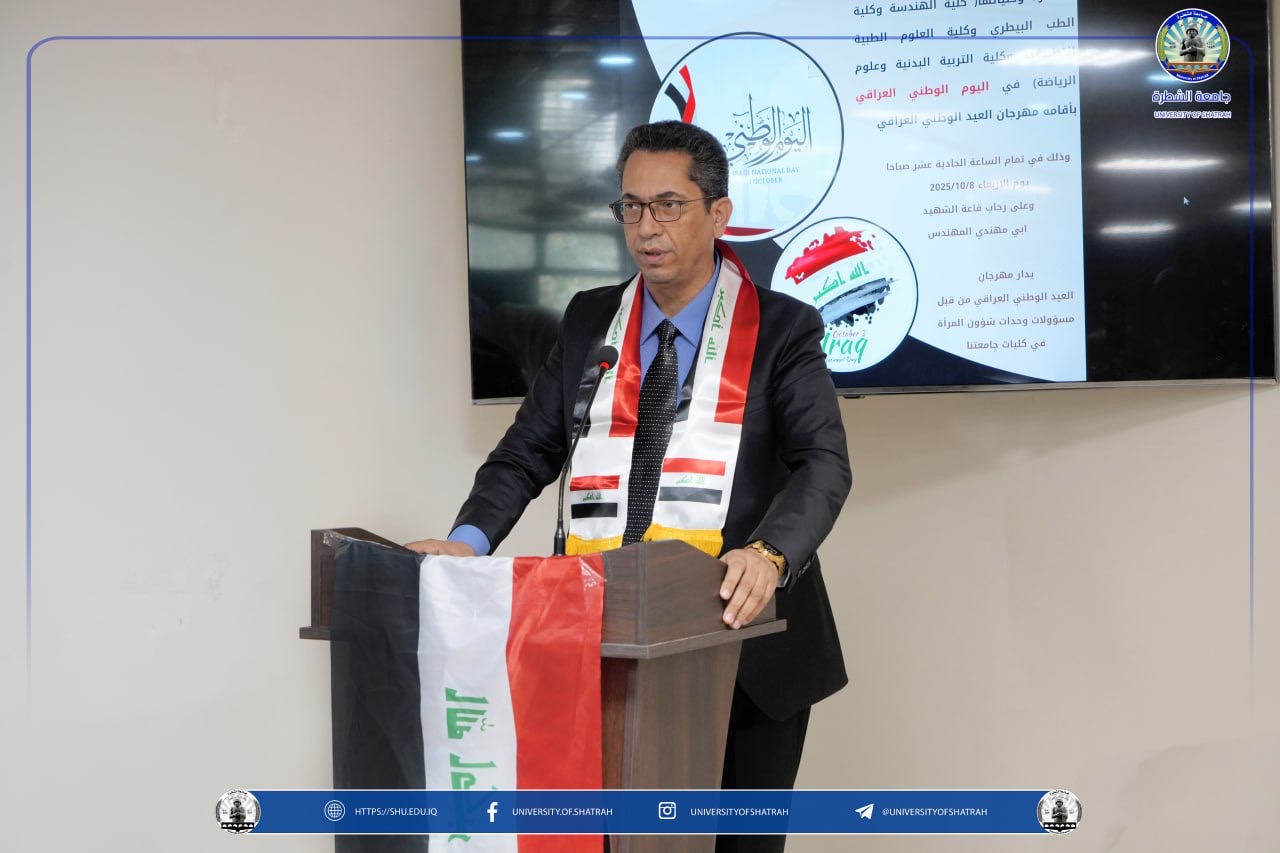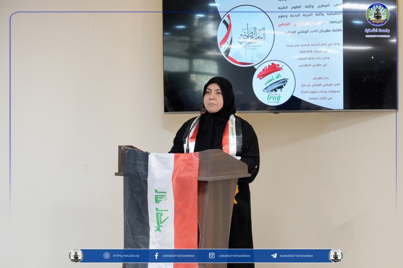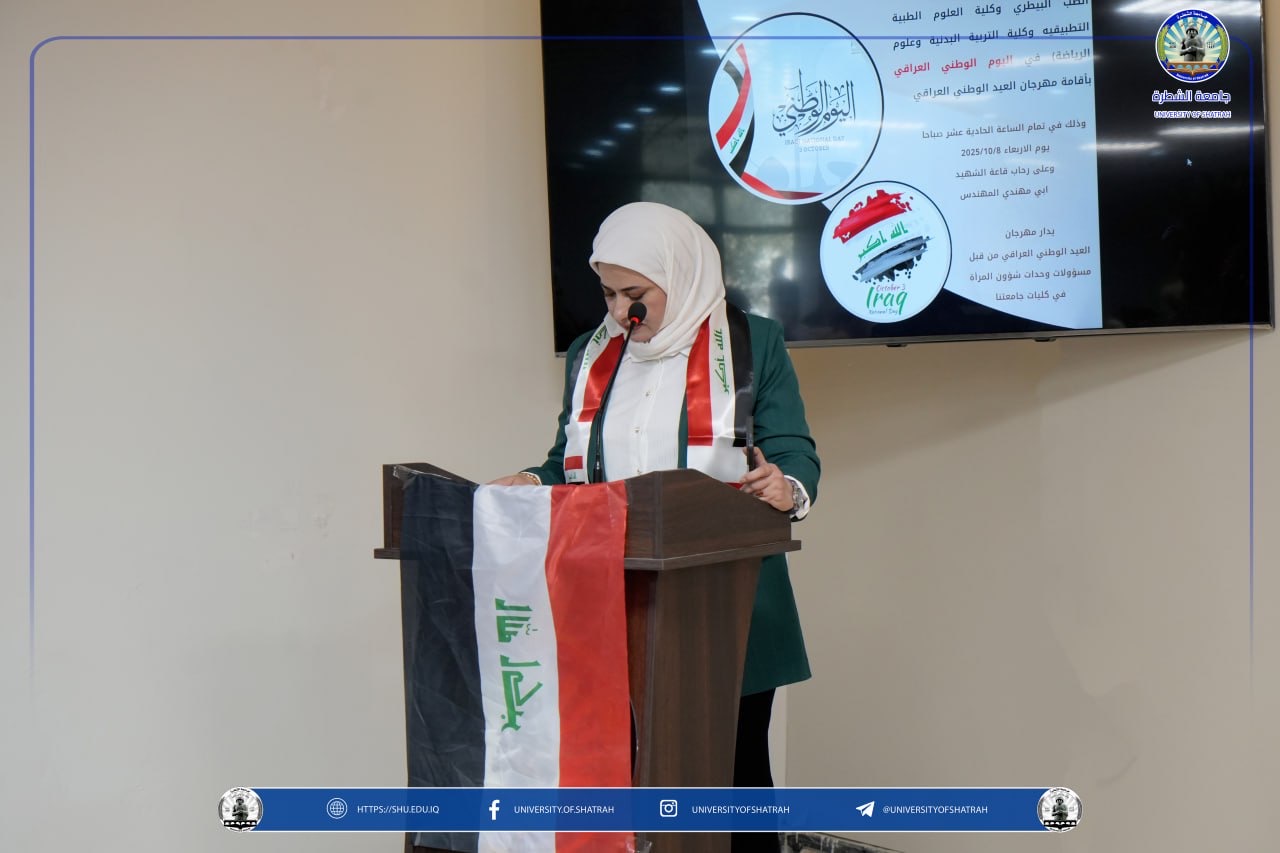 Under the patronage of the President of University of Shatrah , Prof. Dr. Bassem Abdul Hussein Jarallah, the Women's Affairs Division at the University Presidency, in cooperation with the Women's Affairs Units in the Faculties of Engineering, Veterinary Medicine, Applied Medical Sciences, Physical Education and Sports Sciences, and Fine Arts, a festive celebration on the occasion of the Iraqi National Day, on Wednesday, October 8, 2025, at the Martyr Abu Mahdi Al-Muhandis Hall.