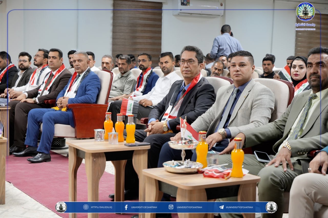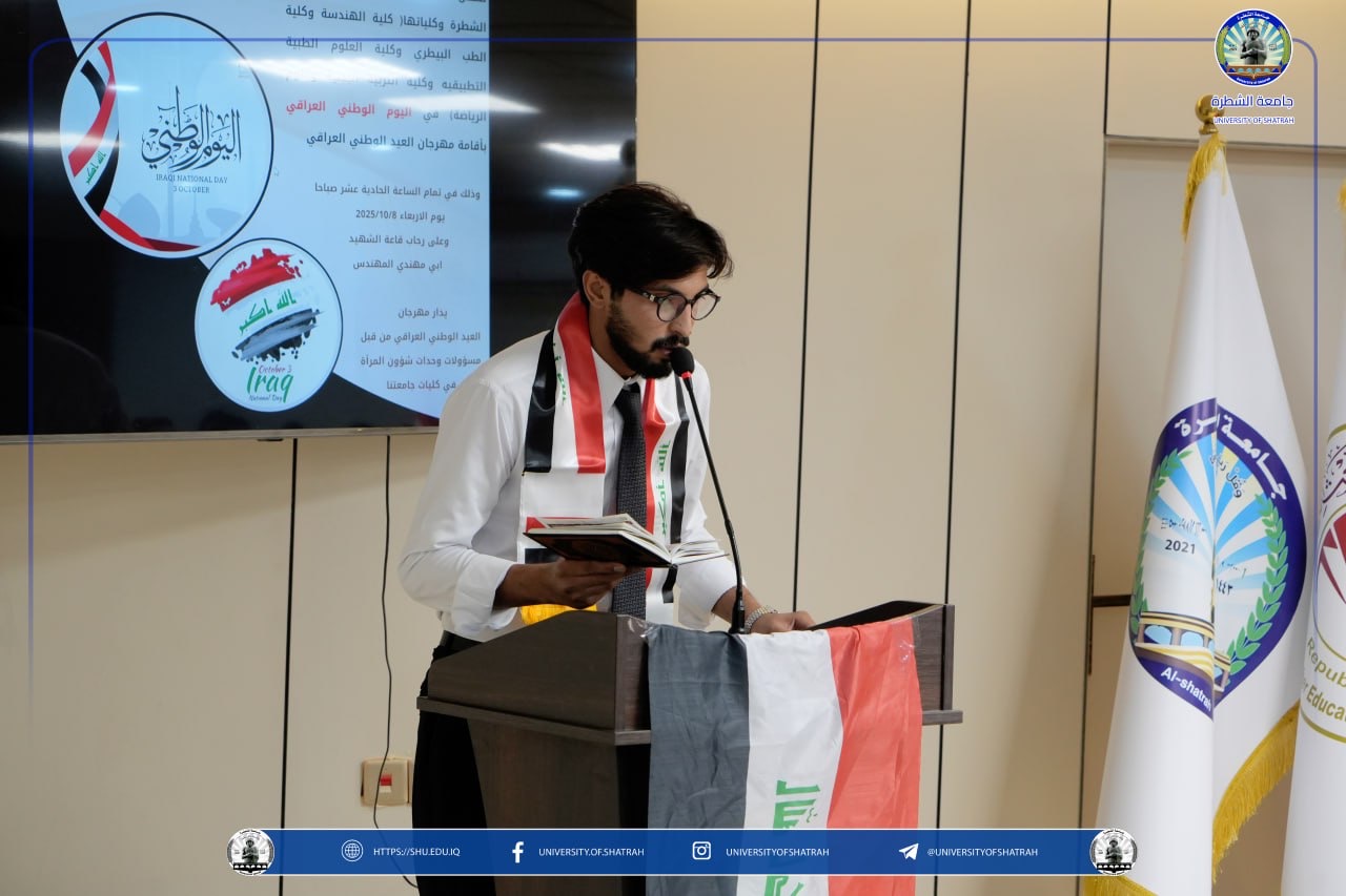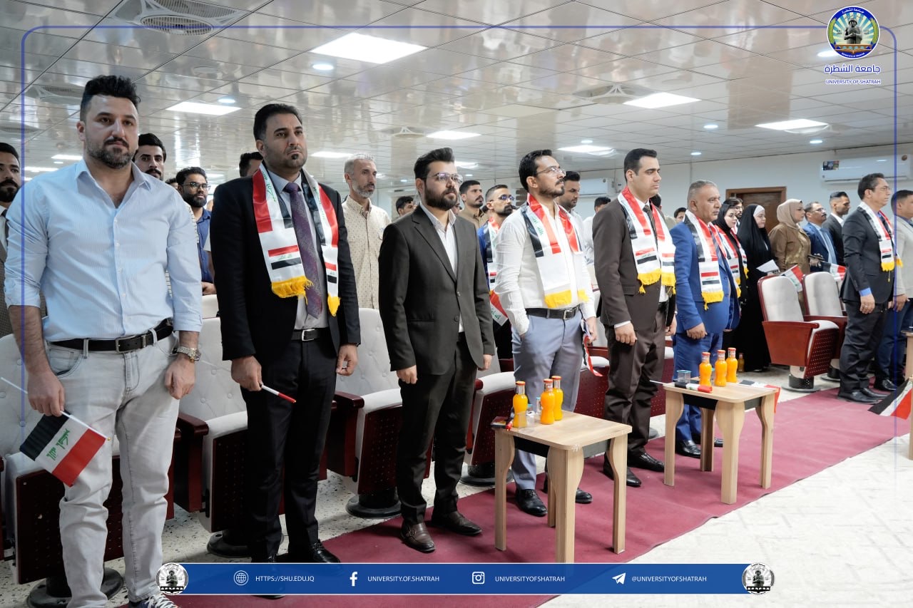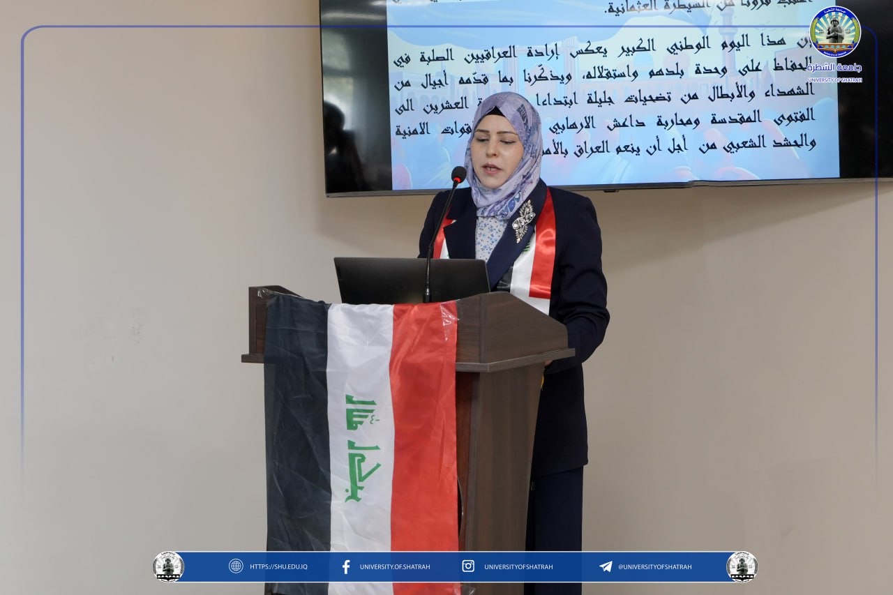 Under the patronage of the President of University of Shatrah , Prof. Dr. Bassem Abdul Hussein Jarallah, the Women's Affairs Division at the University Presidency, in cooperation with the Women's Affairs Units in the Faculties of Engineering, Veterinary Medicine, Applied Medical Sciences, Physical Education and Sports Sciences, and Fine Arts, a festive celebration on the occasion of the Iraqi National Day, on Wednesday, October 8, 2025, at the Martyr Abu Mahdi Al-Muhandis Hall.