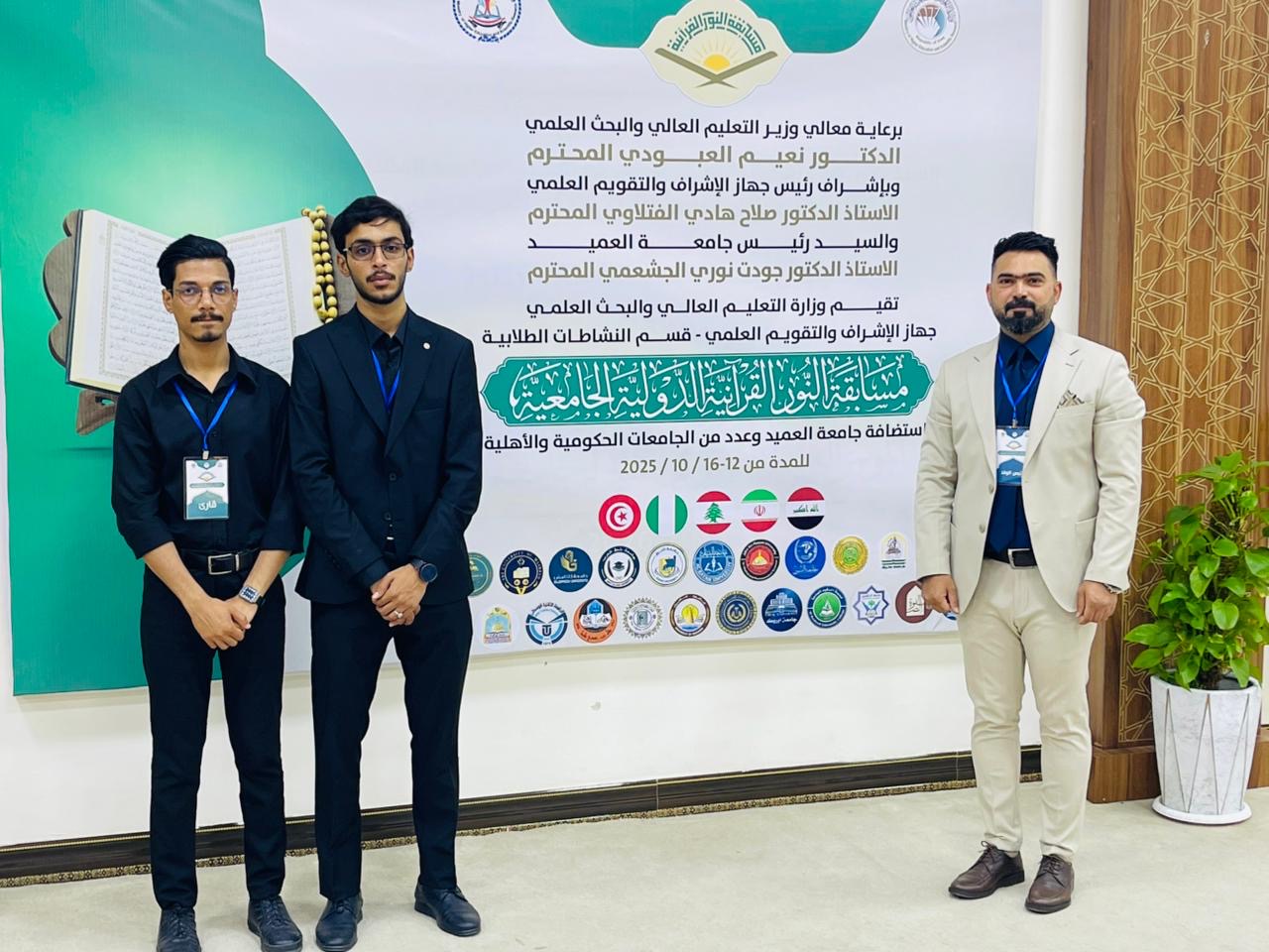 University of Shatrah participated in the Al-Noor International Quran Competition for Iraqi university students, organized by the Scientific Supervision and Evaluation Authority – Student Activities Department at the Ministry of Higher Education and Scientific Research, and hosted by Al-Amid University, with the participation of 49 Iraqi universities from various provinces.