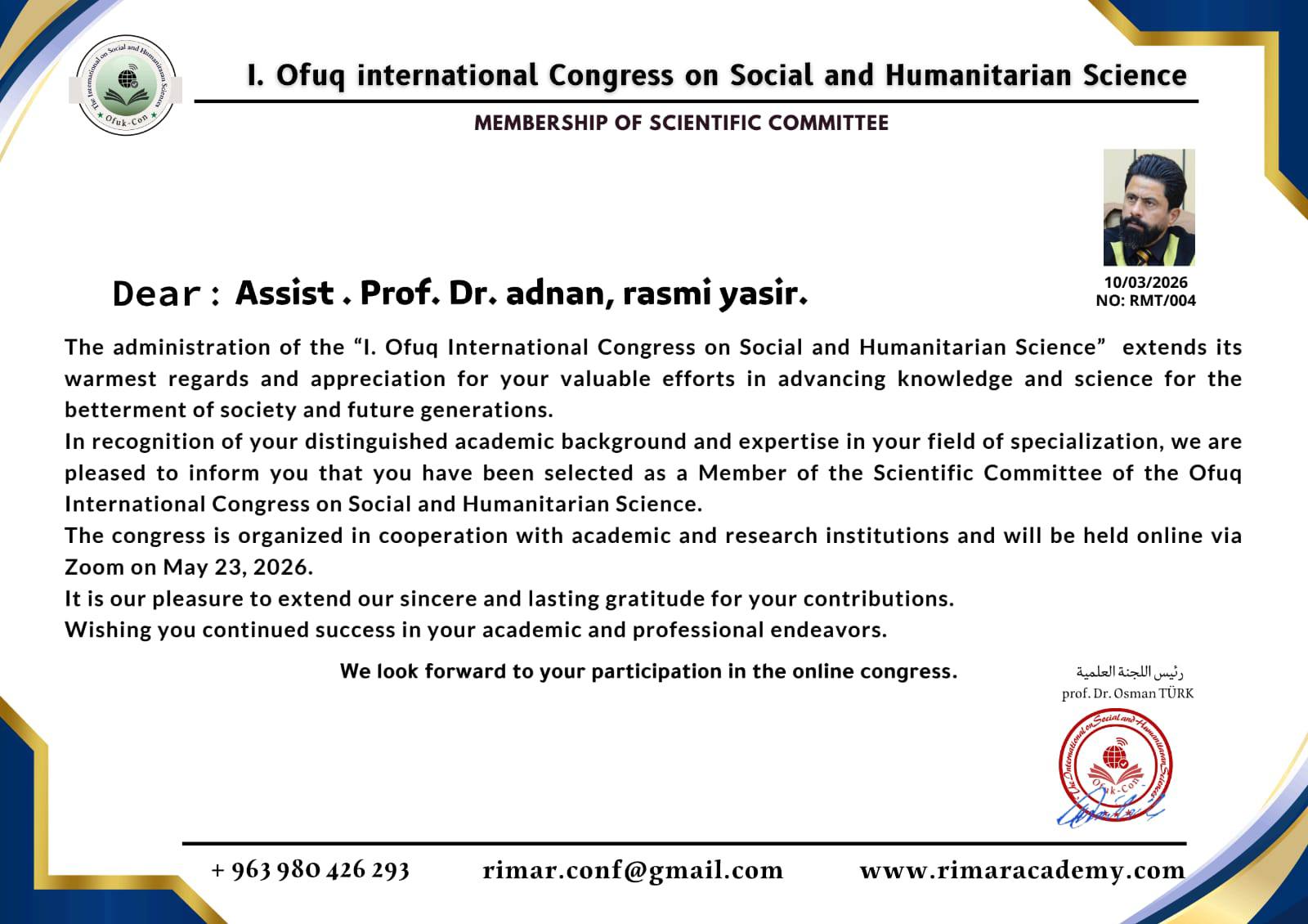 وجاء هذا الاختيار تقديرًا لكفاءته الأكاديمية وخبرته العلمية في مجال البحث العلمي، حيث ستتولى اللجنة العلمية مهمة الإشراف على تقييم البحوث العلمية وفق المعايير المعتمدة في المؤتمرات الدولية.