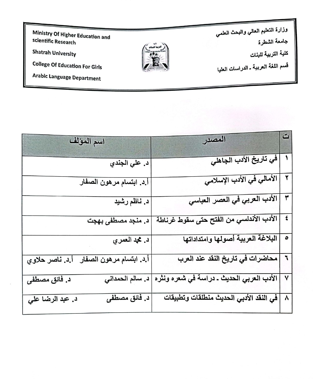 تُعلن كليتنا عن مواد الامتحان التنافسي الخاصة بالتقديم لدراسة الماجستير في تخصص اللغة العربية / الأدب.