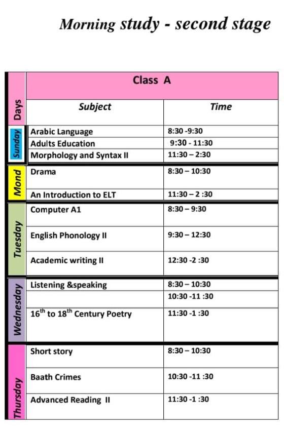 جدول قسم اللغة الانكليزية ( المرحلة الثانية للدراسة الصباحية 2025 - 2026)