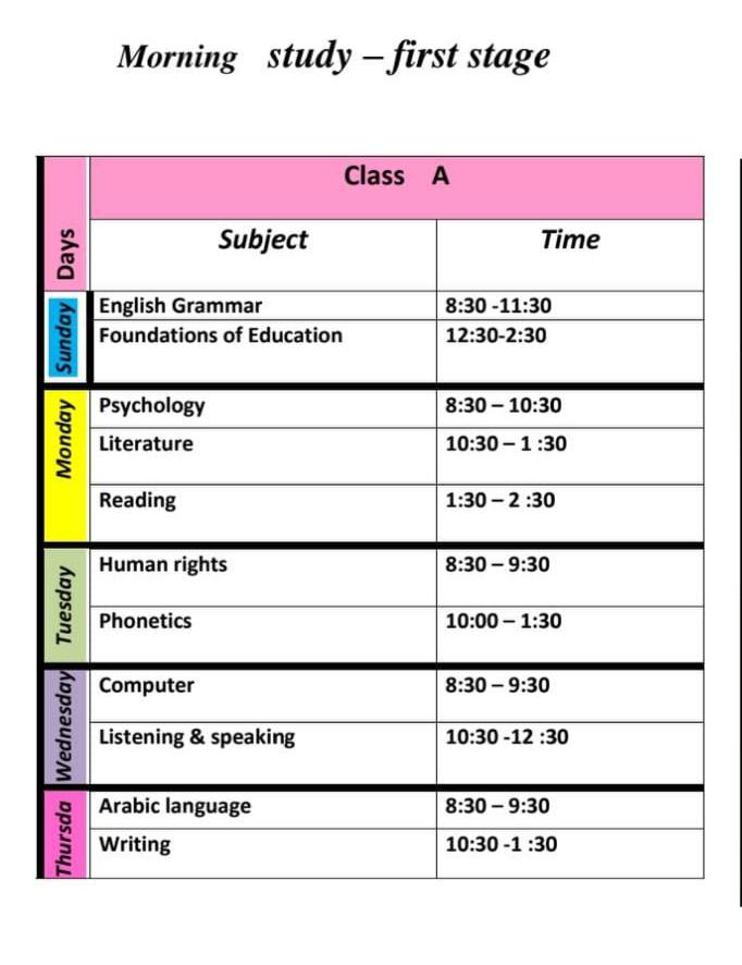 كما يوفر الجدول وضوحًا في تنظيم المواد الدراسية، مما يساعد الطلبة على التخطيط لأوقاتهم الدراسية بشكل فعّال منذ بداية مسيرتهم الأكاديمية.