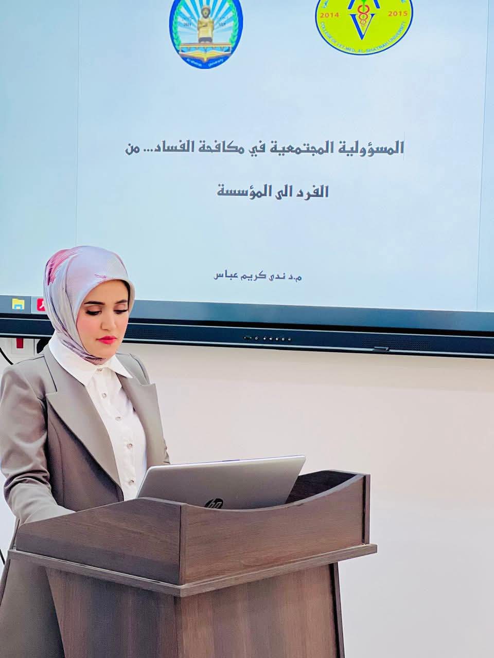 نظّمت شعبة الشؤون القانونية في كلية الطب البيطري، بالتعاون مع وحدة التعليم المستمر، ندوة توعوية بعنوان “المسؤولية المجتمعية في مكافحة الفساد من الفرد إلى المؤسسة”، قدّمتها م.د. ندى كريم عباس، يوم الاثنين 20 تشرين الأول 2025.