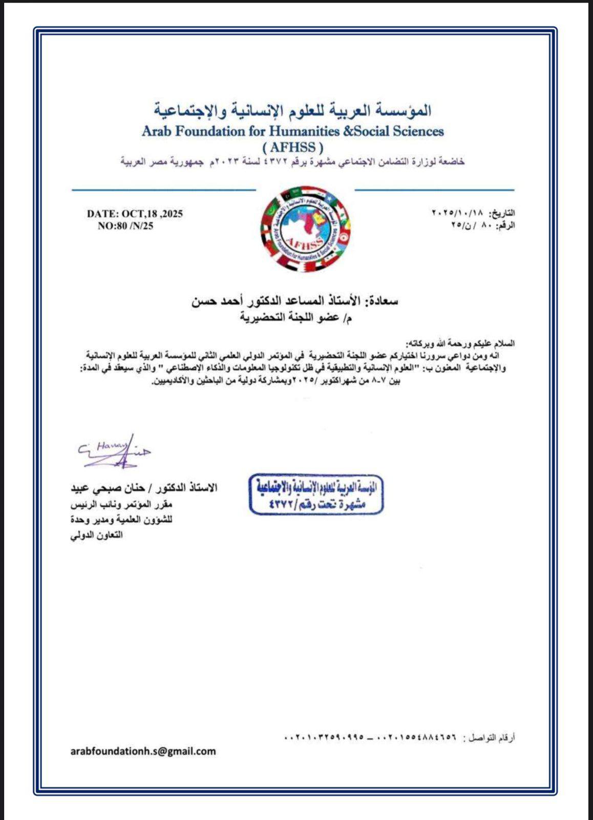 يحمل المؤتمر عنوان: "العلوم الإنسانية والتطبيقية في ظل تكنولوجيا المعلومات والذكاء الاصطناعي"، ويُعقد في جمهورية مصر العربية خلال المدة ٧–٨ تشرين الأول الجاري، بمشاركة واسعة من الأكاديميين والباحثين من مختلف الدول العربية.