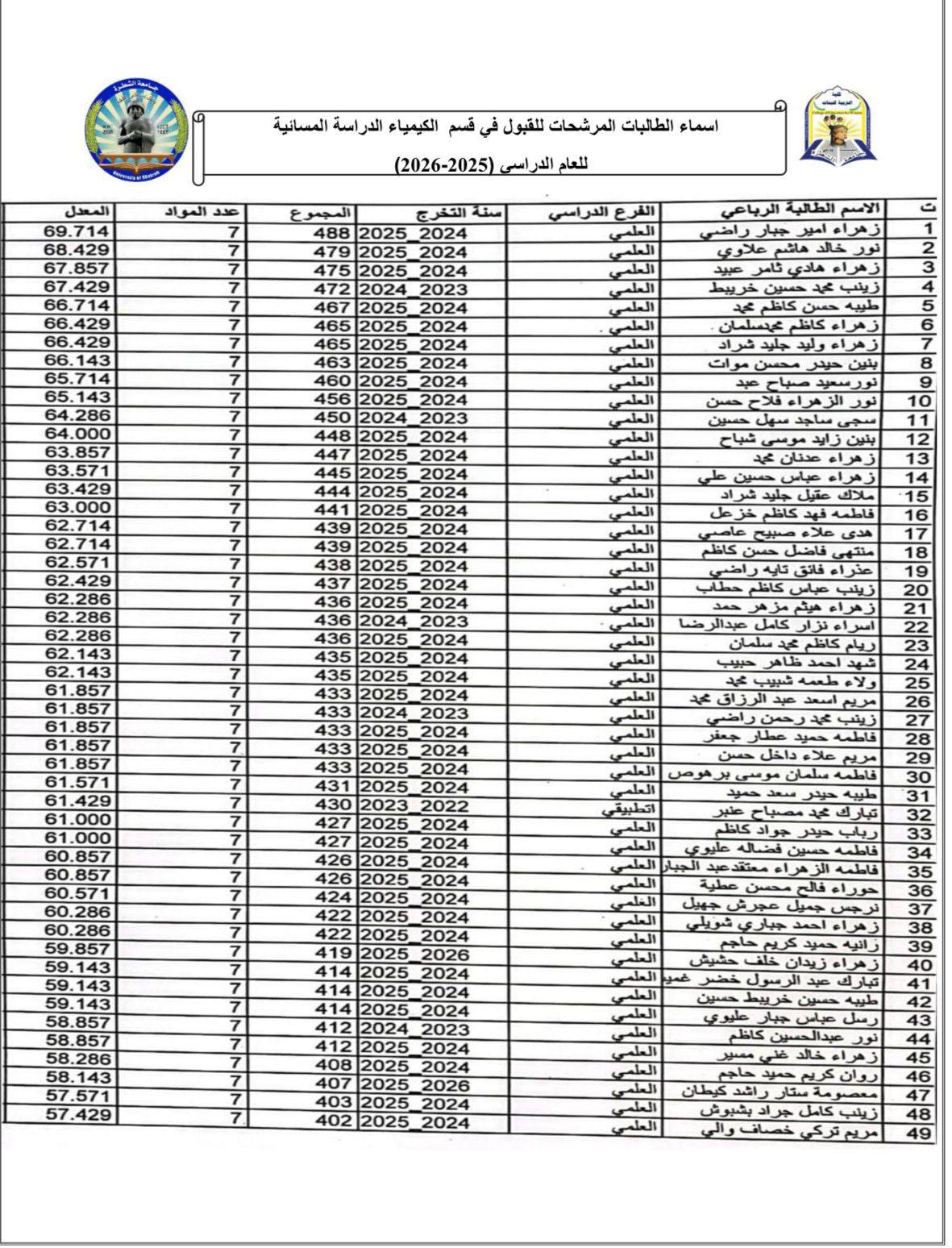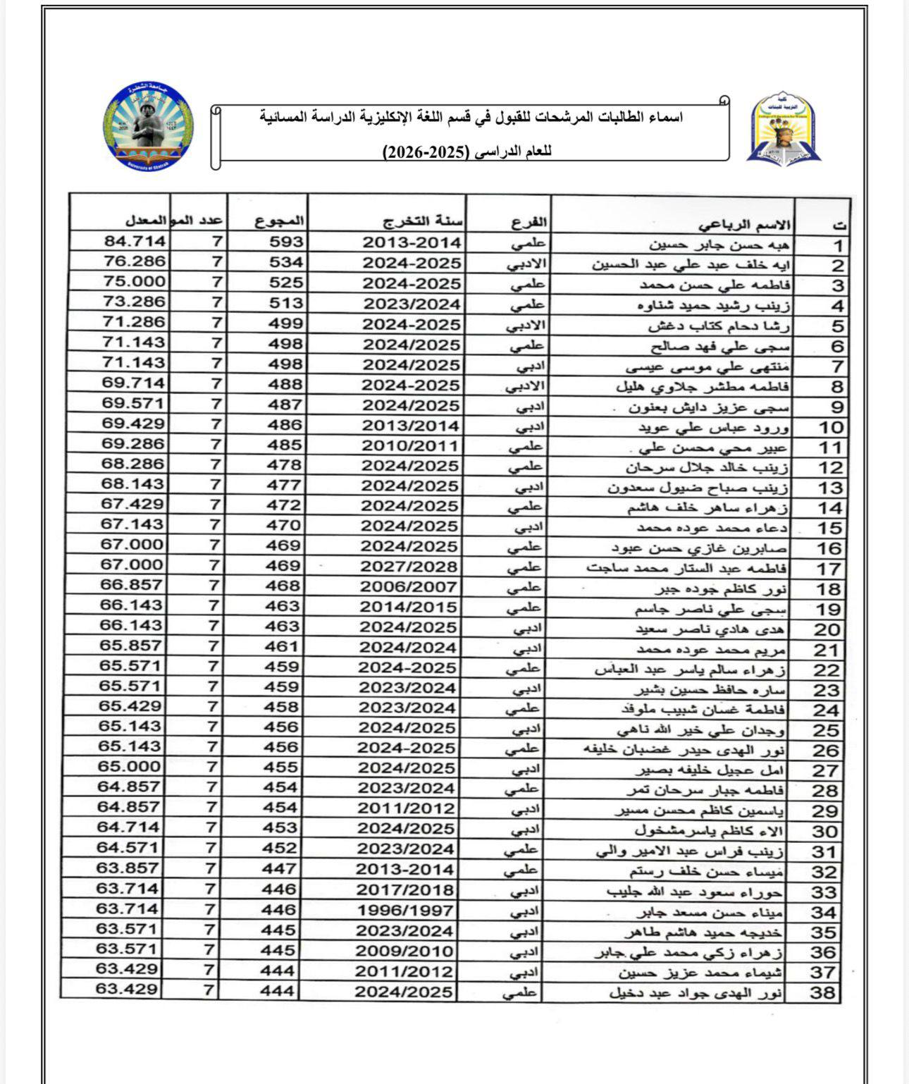وعلى الطالبات المقبولات في هذه الوجبة مراجعة شعبة شؤون الطلبة والتسجيل في الكلية لإكمال إجراءات التسجيل خلال مدة أقصاها خمسة أيام، ابتداءً من يوم الاثنين الموافق 27 تشرين الأول 2025.