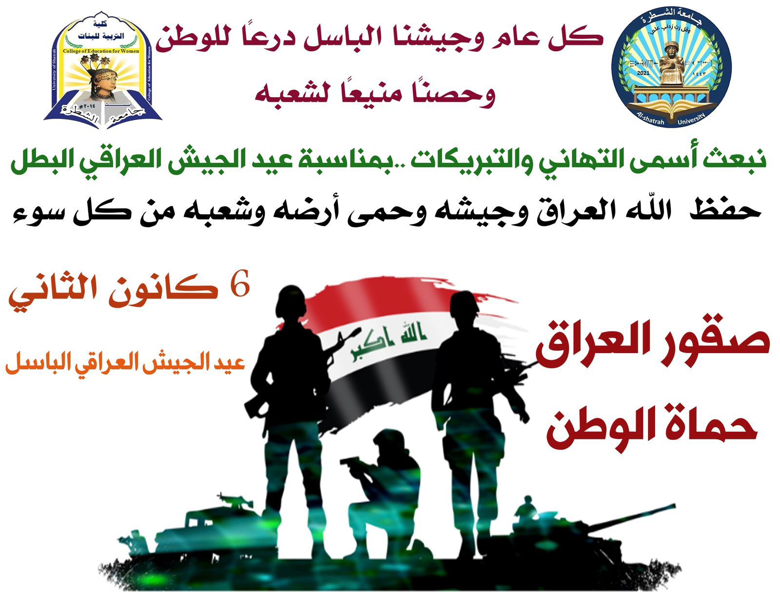 بمناسبة الذكرى المجيدة لتأسيس الجيش العراقي، تتقدم عمادة كلية التربية للبنات – جامعة الشطرة بأصدق آيات التهاني وأسمى عبارات الاعتزاز إلى أبطال قواتنا المسلحة بجميع صنوفهم وتشكيلاتهم.