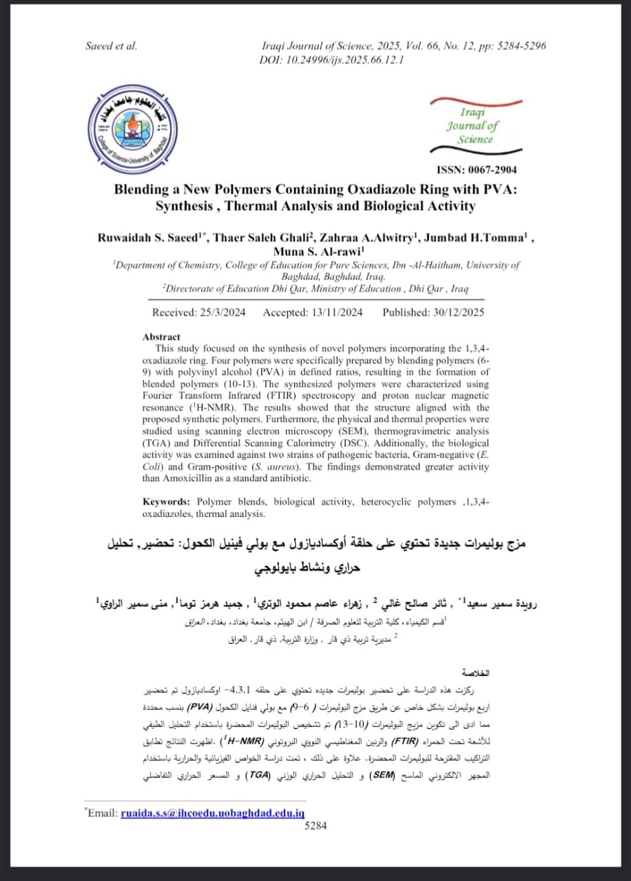 في إطار دعم البحث العلمي وتشجيع التعاون الأكاديمي بين الجامعات العراقية، تم نشر بحث علمي مشترك للدكتور ثائر صالح غالي، رئيس قسم الكيمياء في كلية التربية للبنات / جامعة الشطرة، بالتعاون مع باحثين من جامعة بغداد / كلية التربية للعلوم الصرفة – ابن الهيثم، في المجلة العراقية للعلوم، وهي مجلة علمية معتمدة ومُدرجة ضمن مستوعبات Scopus (الربع الثالث Q3).