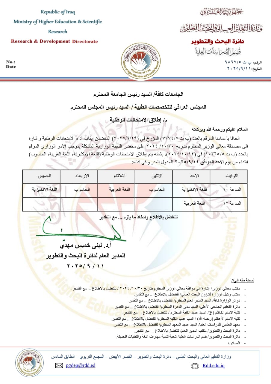يسر مركز الحاسبة الالكترونية في جامعة الشطرة عن اعلان استئناف اجراء الاختبار الوطني الموحد ( للغة الانجليزية ، اللغة العربية ، الحاسوب ) من يوم الاحد الموافق 2025/9/14 و حسب التوقيتات المحددة في الصورة ادناه.
