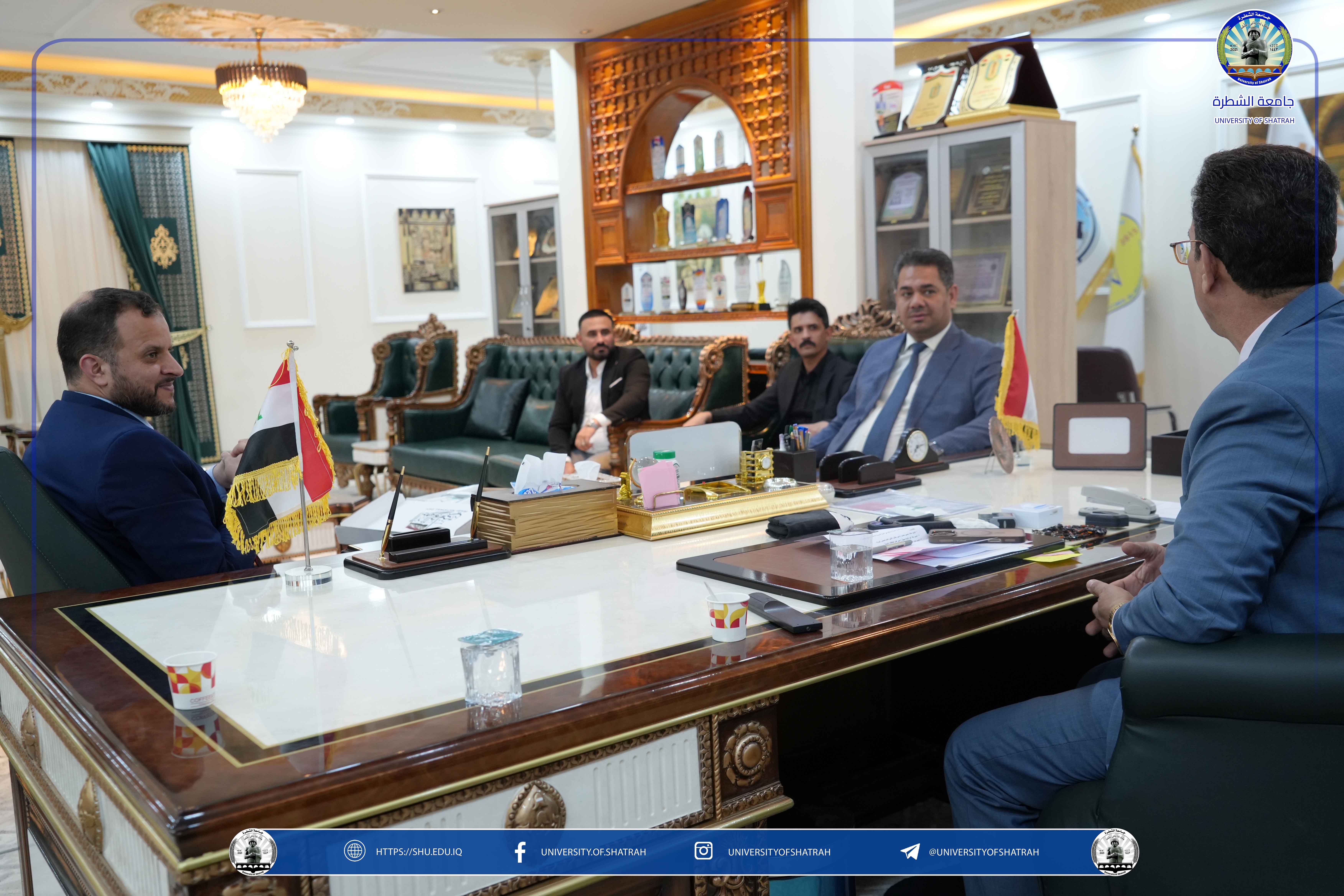 استقبل رئيس جامعة الشطرة الأستاذ الدكتور باسم عبد الحسين جار الله وفداً من جهاز الأمن الوطني ومفوضية حقوق الإنسان، وذلك على هامش الاحتفال المركزي الذي أقامته الجامعة بمناسبة اليوم الوطني العراقي يوم الخميس الخميس 2 تشرين الأول 2025 في مكتبه